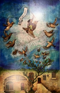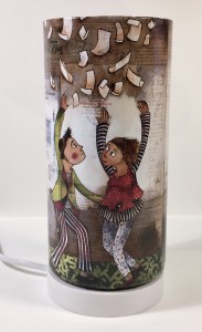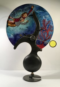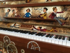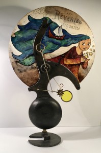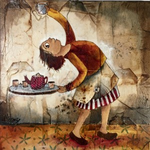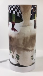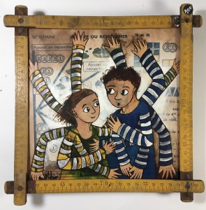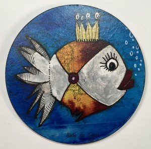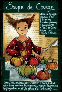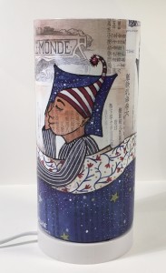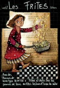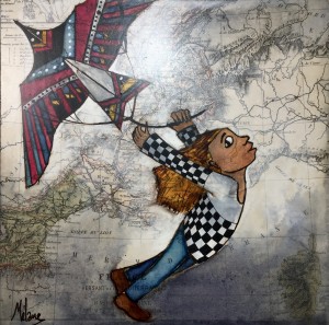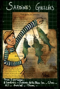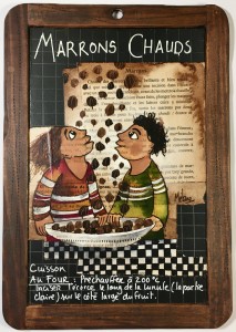 Les supports de ses illustrations sont également chinés dans les greniers de nos grandes mères : 78 tours, planches à découper, miroirs, ardoises, portes d’armoires...
